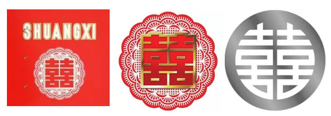 上诉委员会将争议商标与三个在先商标一一对比,认为商标在形状、结构、视觉表现以及颜色组合上都不相同,产生完全不同的整体印象。争议商标与在先商标唯一相似之处在于它们都含有一个装饰性的线条图形(“囍”)。经仔细检查,线条图形在结构上具有相似点,但仅此不能使商标成为近似。